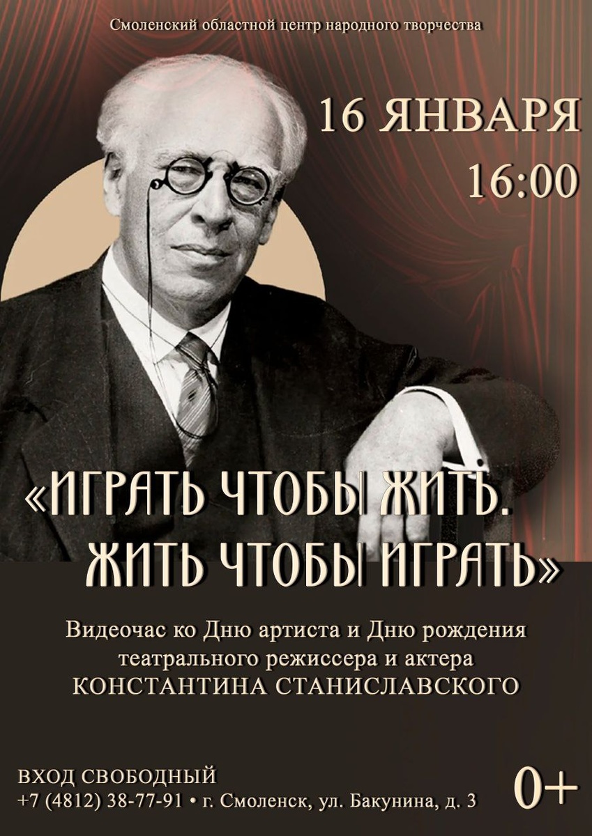! 16 января в 16:00 в Центре Народного творчества состоится мероприятие, приуроченное ко Дню артиста и 163-летию со дня рождения театрального режиссера и актера Константина Станиславского. 🎭Приглашаем вас вместе с нами погрузиться в удивительный мир великого театрального деятеля. В программе: история зарождения гениальной системы Станиславского и ее воплощение в современных спектаклях и фильмах. Вход свободный 📍Адрес: ул. Бакунина,3 ☎️Телефон: 38-77-91 #СмоленскийЦентрНародногоТворчества