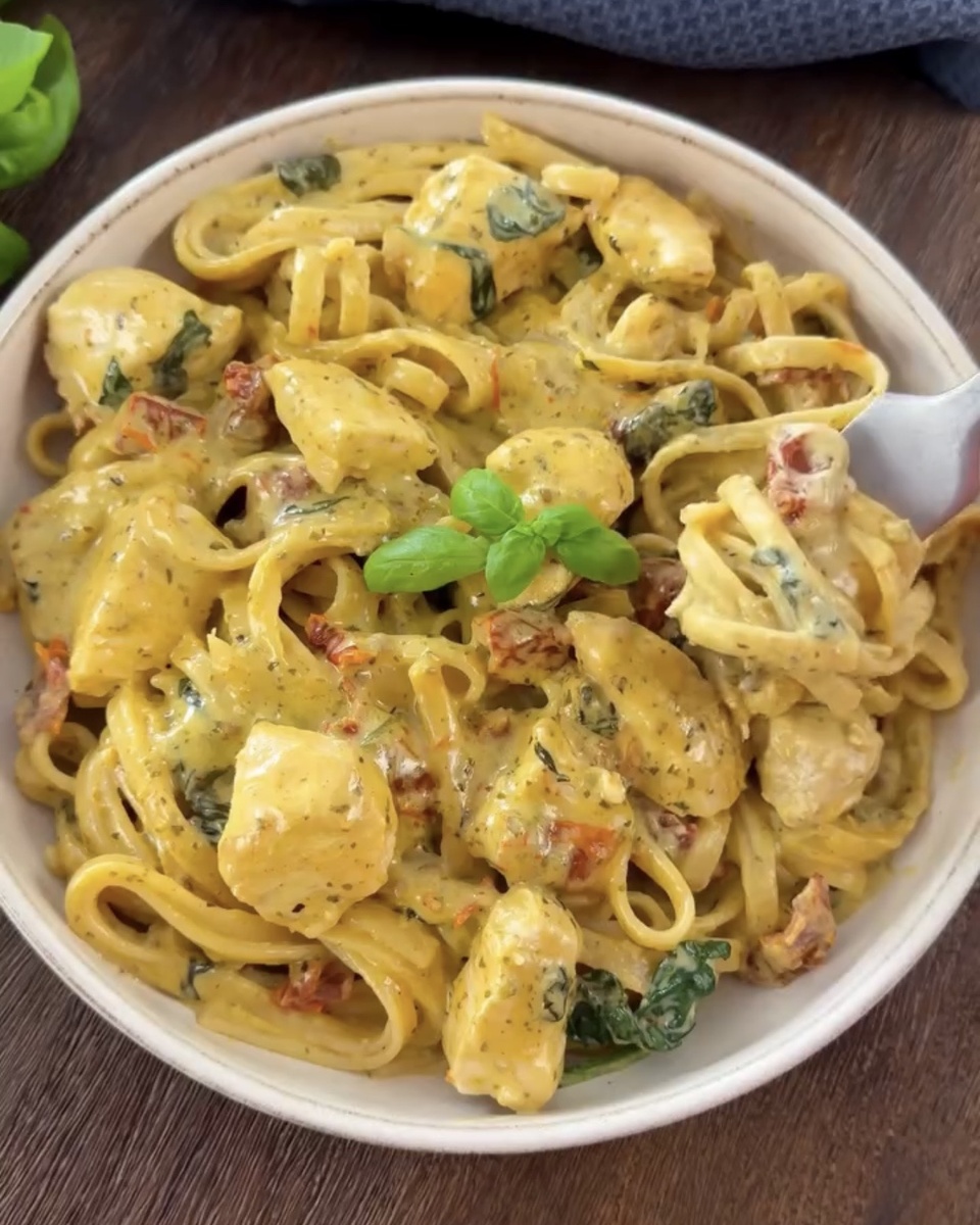 🍝 Ингредиенты (на 3–4 порции): 500 г куриного филе (грудка) 250 г спагетти или лингвини (сухие) 80 г свежего шпината 90 г вяленых томатов в масле (слить масло) 2 ст. л. оливкового масла 450 мл овощного бульона (или воды + кубик) 200 мл сливок для взбивания (20–30%) 80 г сливочного сыра (типа «Филадельфия») 2 ст. л. готового песто (базиликовое) 40 г тёртого пармезана 1 ч. л. сушёного орегано 1 ч. л. сладкой паприки Соль и чёрный перец — по вкусу Время приготовления: 30 минут Калорийность ≈ 550–650 ккал на порцию (в зависимости от жирности сливок) 🔗Пошаговый рецепт https://dzen.ru/a/aWjF9gcHs1RIHtmF