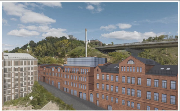 Она станет своеобразным связующим звеном между зданиями бывшей мельницы Башкировых. Для облицовки выбран классический керамический кирпич, верхняя стеклянная часть здания отодвинута таким образом, чтобы не менять визуального восприятия исторической улицы, вместе с тем создавая гармоничную композицию застройки, если смотреть со стороны спуска с метромоста.