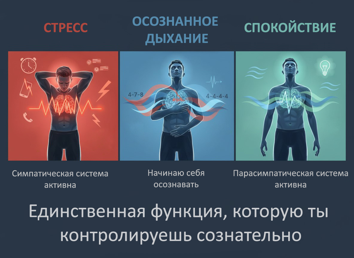 Медленное, глубокое дыхание активирует парасимпатическую нервную систему - ту, что отвечает за расслабление, переваривание, восстановление.