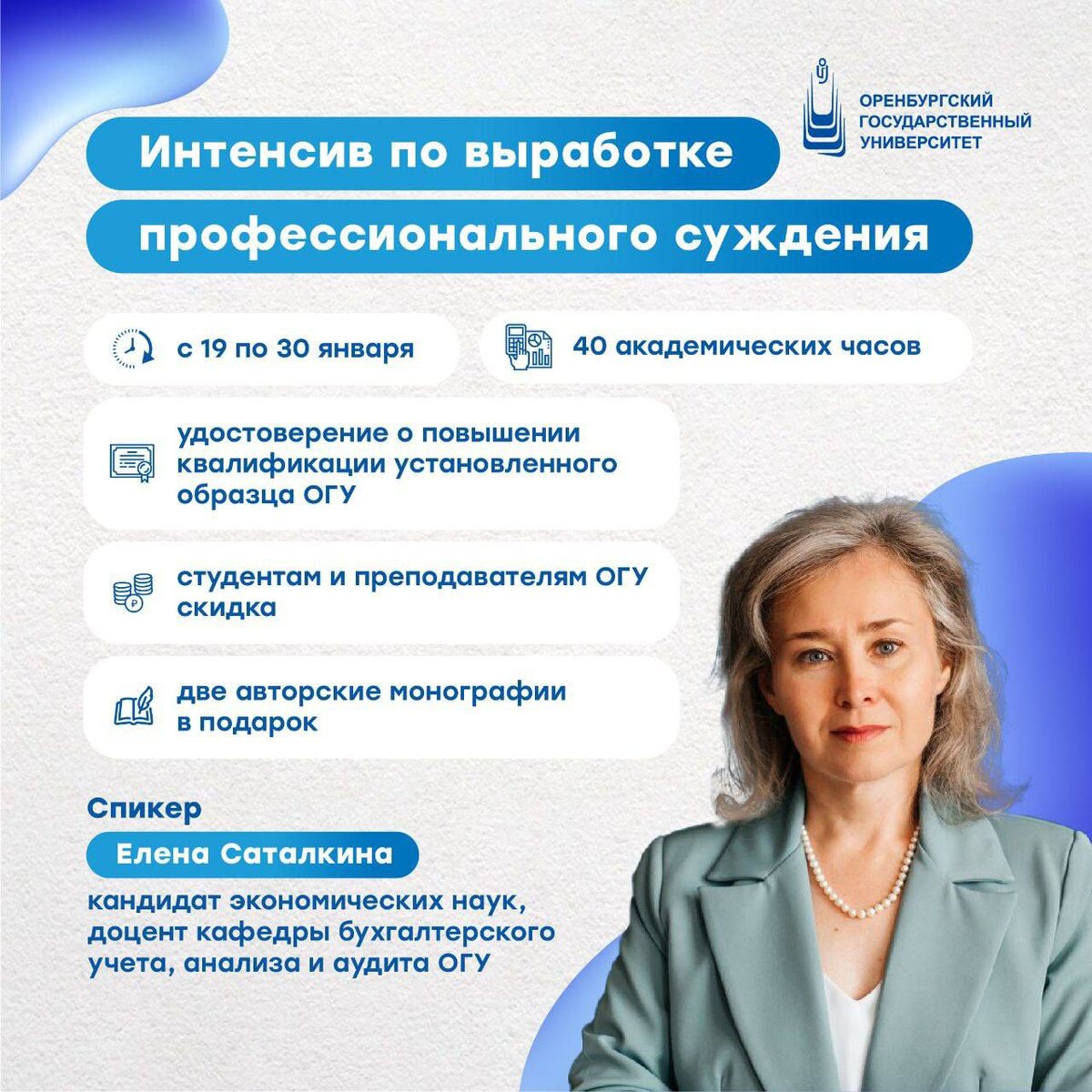 » 📊 В ситуации постоянно меняющихся стандартов и сложных хозяйственных операций умение аргументировать и принимать взвешенные решения становится очень важным. Курс предлагает системный подход и практические инструменты для развития этого навыка. Программа объёмом 40 академических часов включает ключевые аспекты от теории и нормативной базы до современных концепций применения в российской и международной практике (МСФО, МСА). Особое внимание уделено рассмотрению влияния профессионального суждения на финансовые результаты и состояние организации, а также на ход проводимой проверки и формируемое заключение аудитора 🙌 Ведущий эксперт интенсива, кандидат экономических наук, доцент кафедры бухгалтерского учета, анализа и аудита Елена Саталкина, совмещающая академические знания с практическим опытом. Занятия пройдут с 19 по 30 января. По завершении выдаётся удостоверение о повышении квалификации установленного образца. Дополнительно каждый участник получит авторскую монографию с подпись
