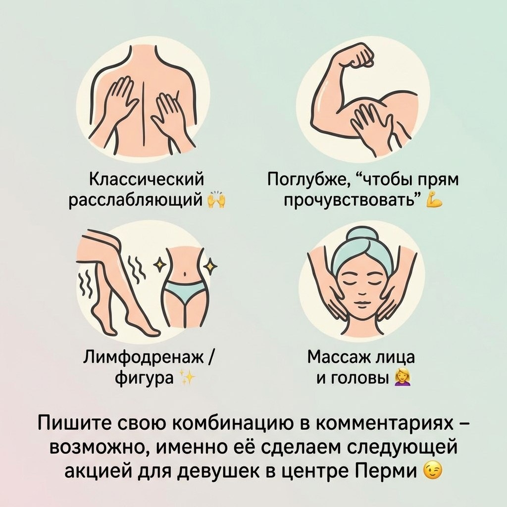 ? 👐 Классический расслабляющий 💪 Поглубже, “чтобы прям прочувствовать” ✨ Лимфодренаж / фигура 💆 Массаж лица и головы Пишите свою комбинацию в комментариях – возможно, именно её сделаем следующей акцией для девушек в центре Перми 😉 https://n1935545.yclients.com/
