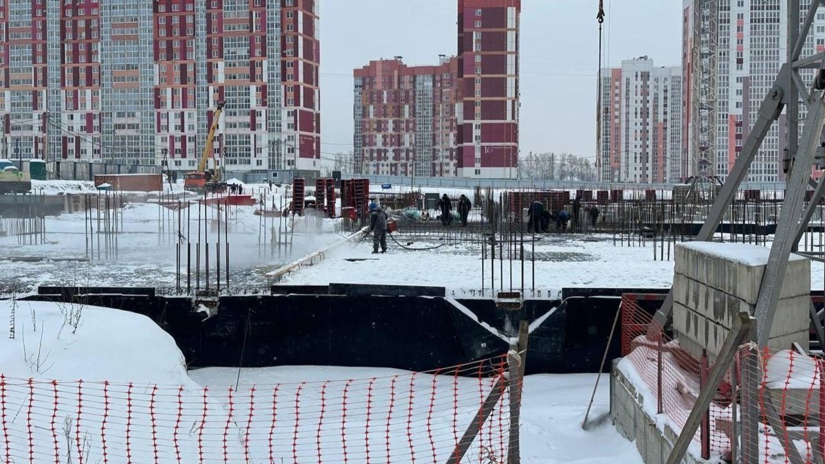 Строители школы под Орлом очищают опалубку от снега, чтобы продолжить работы