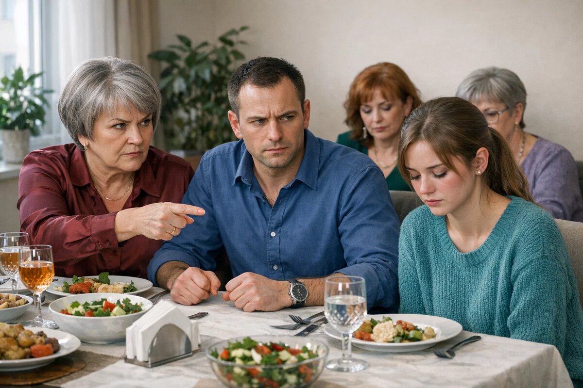 Маргарита Степановна улыбается, но губы сжаты в тонкую линию. За столом трое её подруг: Зинаида Ивановна, Людмила и Тамара. Они переглядываются, но молчат. Алена краснеет, пальцы дрожат. Она передаёт салфетницу и убирает руки под стол.