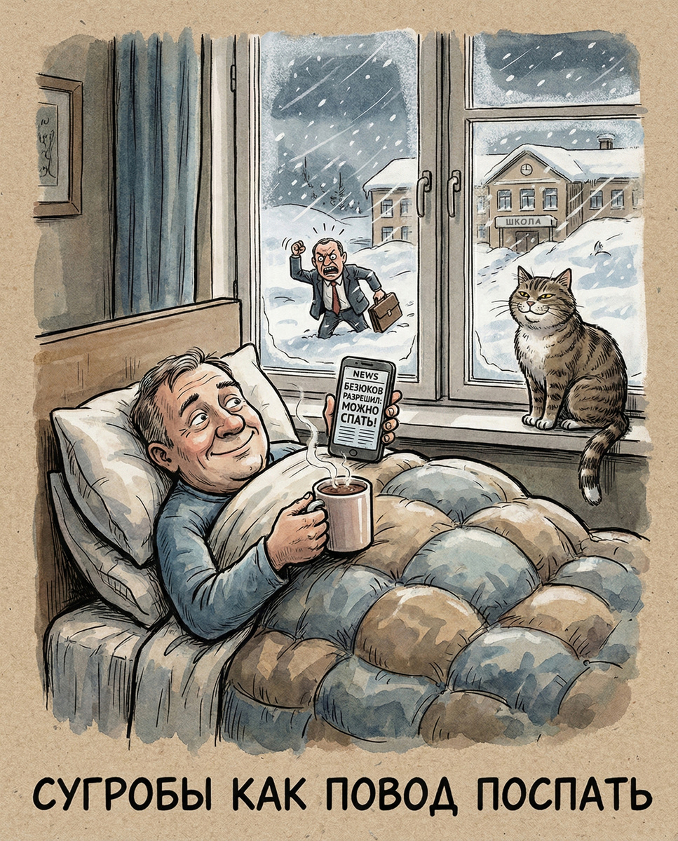 В детстве я мечтал, чтобы школу завалило снегом по самую крышу. Чтобы директор, барахтаясь в сугробе, кричал: «Занятий не будет! Все по домам — пить какао!». Школа закончилась, какао подорожало, а дедлайны стали злее крещенских морозов. Но тут пришёл Алексей Безюков из профсоюзов (ФНПР) и принёс благую весть. Оказывается, если на улице апокалипсис, вы имеете полное право остаться под одеялом. Снежная буря, землетрясение или извержение вулкана в соседнем дворе — теперь это ваш официальный «прогулочный» билет. 🗣 Главный технический инспектор труда так и говорит: «Такие чрезвычайные ситуации дают возможность людям... не выходить на работу». Правда, есть нюанс: нужно поставить босса в известность. Представляю этот диалог: — Алло, шеф, тут у меня дом трясётся и лава из-под плинтуса. Я сегодня из дома? — Безюкова начитался? Беги быстрее лавы, отчёт сам себя не допишет! Но эксперт на вашей стороне: подтвердить факт «пушистого зверька песца» можно сводкой метеослужбы, информацией транспортник