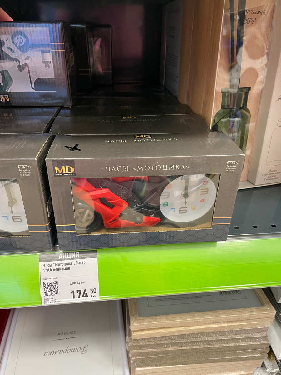 Первое, что бросилось в глаза — необычные настенные часы в виде мотоцикла. Смотрятся очень эффектно, сразу притягивают взгляд. Такой декор отлично подойдёт для подарка или для интерьера с изюминкой. А цена вообще порадовала — около 174 рубля.