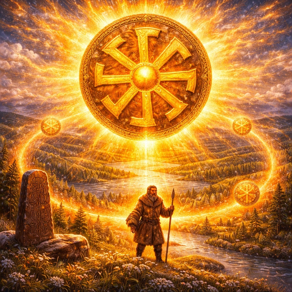 – возвращается. Древний человек смотрел на небо не ради красоты. Он смотрел, чтобы выжить. И именно небо задало форму Коловрата. Главная ошибка современного взгляда — представлять Солнце как статичную точку. Для традиционного сознания Солнце — это путь, а не объект. Оно: