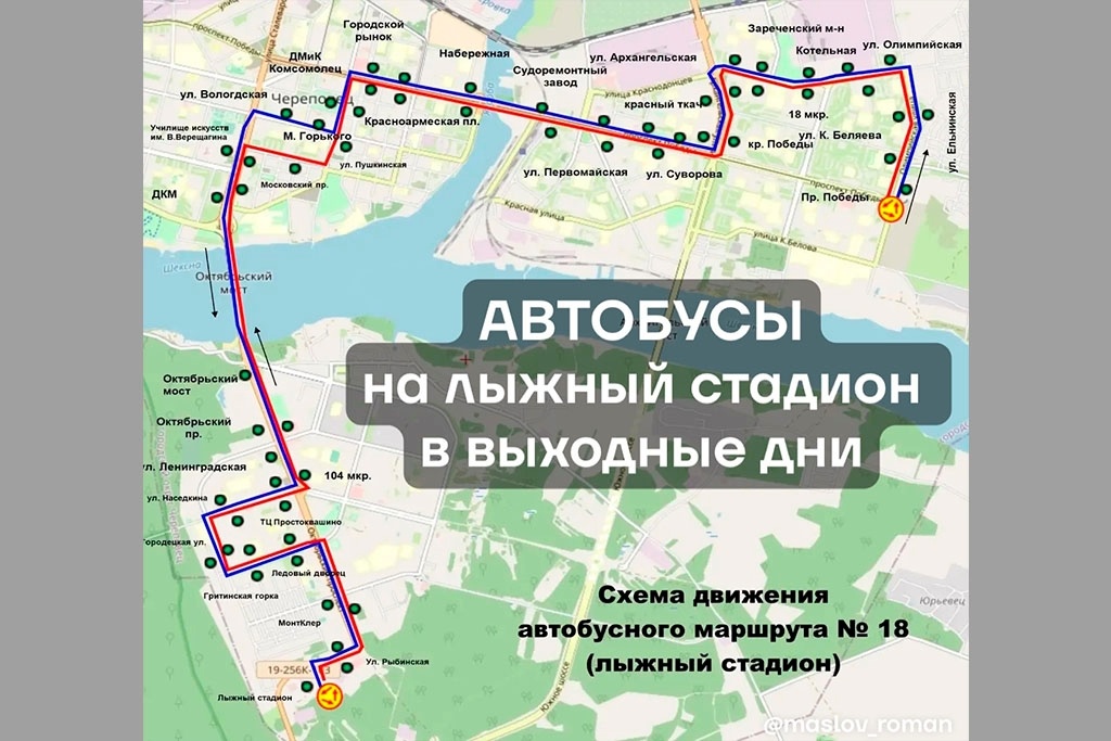Об этом сегодня в своих соцсетях сообщил глава города Роман Маслов. "В новогодние праздники мы запустили маршрут автоколонны № 1456 до лыжного стадиона, и автобус оказался востребованным. Получили множество теплых откликов. С 17 января маршрут № 18 будет ходить до лыжного стадиона по выходным. Расписание такое же, как в новогодние праздники", - сообщил Роман Маслов. В направлении стадиона (от остановки "улица Олимпийская") первый автобус отправляется в 6:55, последний - в 18:50. Интервал движения - каждые 15−20 минут. Обратно (от стадиона - в Заречье) первый автобус уходит в 8:02, последний - в 19:59. Автобусы вне этих интервалов пойдут по обычному маршруту. Источник: https://cherinfo.ru/news/144360-v-cerepovce-avtobus-no-18-po-vyhodnym-budet-ezdit-do-lyznogo-stadiona