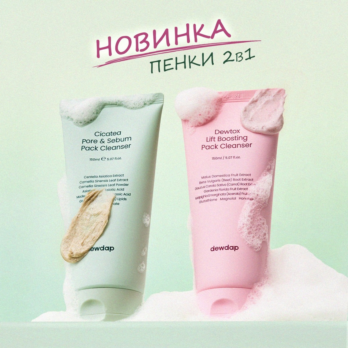 💖 Представляем вам новинку - сразу ДВЕ потрясающие очищающие пенки бренда Dewdap, каждая из которых способна стать настоящим спасением для вашей кожи! ✅ CICATEA PORE & SEBUM PACK CLEANSER - Это нежная пенка с экстрактом центеллы азиатской и белого чая, бережно очищает кожу, регулирует выработку кожного сала и глубоко очищает поры. Благодаря активным компонентам оказывает успокаивающее воздействие, идеально подходит для комбинированной и склонной к жирному блеску кожи. ✅DEWTOX LIFT BOOSTING PACK CLEANSER - Освежающая пенка с натуральными соками яблока, свеклы и моркови (ABC-комплекс), глутатионом и уникальным компонентом - коллагеном гибискуса. Эта формула помогает мягко очистить лицо, обеспечивает антиоксидантную защиту и улучшает тургор кожи. Подходит даже чувствительной кожи. 🌟Уникальная особенность обеих пенок: Каждая из них может использоваться как обычная утренняя и вечерняя пенка для очищения, а также в качестве маски для более интенсивного ухода. Для достижения эффекта глуб