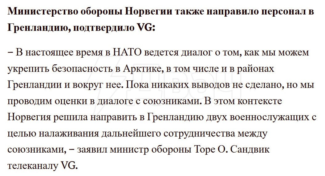 ⚡️Норвегия отправила двух военных в Гренландию на фоне угроз Трампа