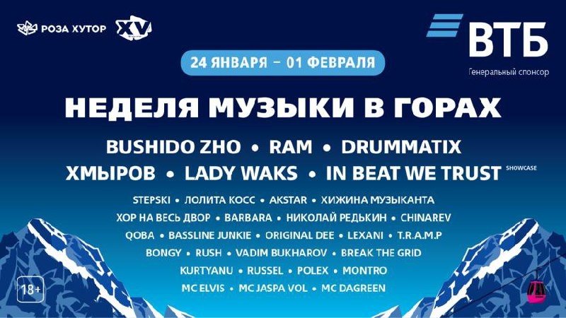 🎤 – BUSHIDO ZHO, RAM, Drummatix, Хмыров, Лолита Косс и др. 📍 – «Роза Хутор», Сочи, с. Эстосадок, Олимпийская ул. д. 35 🗓 – 24 января – 1 февраля 💵 – от 2 500 руб. скидка 25% при оплате через СБП 🔗 – билеты (18+) #концерты #билетынаконцерт #розафест #сочи #розахутор #bushidozho #ram #drummatix #хмыров #лолитакосс 👉 Список концертов: январь • февраль • март @est_prohodka