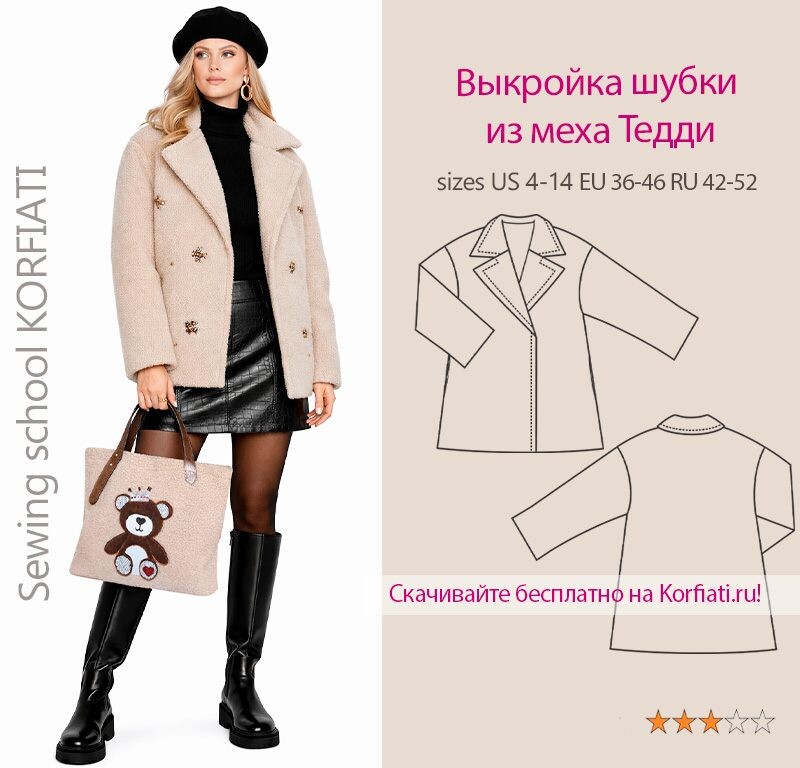 Один из неоспоримых трендов зимних сезонов — изделия из искусственного меха под названием «Тедди». Такие модели входят в число самых уютных и востребованных тенденций последних лет, и их популярность не спешит снижаться. И дело не столько в теплосберегающем качестве материала, сколько в его необычном виде. Слегка вьющаяся и невероятно приятный на ощупь текстура меха напоминает игрушечного мишку из нашего детства. Именно благодаря сходству с текстурой игрушечного мишки мех и получил свое название. В этом уроке мы предлагаем вам выкройку шубки из меха Тедди. Вы можете скачать готовую выкройку на шесть стандартных размеров бесплатно и сшить такую шубку самостоятельно. Выкройку сумки, представленной на фото, мы опубликуем в одной из наших следующих рассылок. Чтобы не пропустить ничего полезного, следите за новостями Школы шитья Анастасии Корфиати! В материале: -Что такое мех Тедди: способ производства и состав