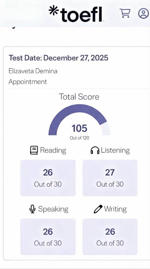 пока все отдыхали на новогодних, одна из учительниц SPEAKEASY Елизавета получила сертификат TOEFL с подтверждением уровня С1 по английскому. Такой международный сертификат официально подтверждает уровень языка во всём мире🔥 очень гордимся! Сам сертификат присылается позже, но в её личном аккаунте виден вот такой результат все наши учителя имеют различные международные сертификаты как об уровне языка, так и о преподавании английского помимо высшего образования в лингвистике/педагогике
