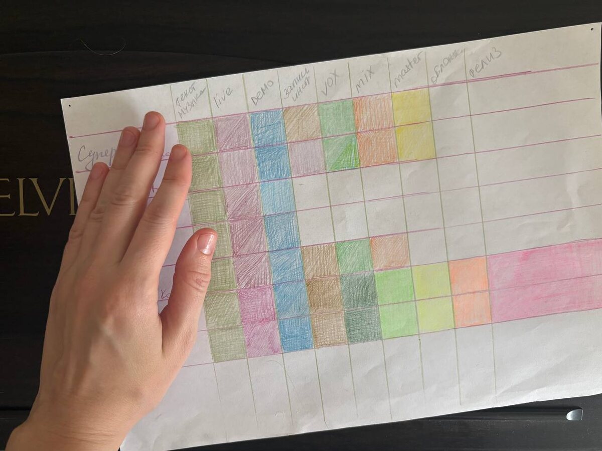 Что в результате? Этот тетрис бесит меня каждый день! У песни, которую я хотела выпустить первым синглом, закрашено меньше всего квадратиков. Я должна была бы на этой неделе отправить её на платформы, а мы только планируем запись барабанов (но это уже завтра). Но я напоминаю себе, что всё это делается не для рекордов, не для стримингов, не для алгоритмов. А для слушателей. Для себя. Для интереса. Поменьше давления, Анна, побольше удовольствия. Что-нибудь когда-нибудь да выпустим. Ну хоть что-нибудь. Хоть когда-нибудь.