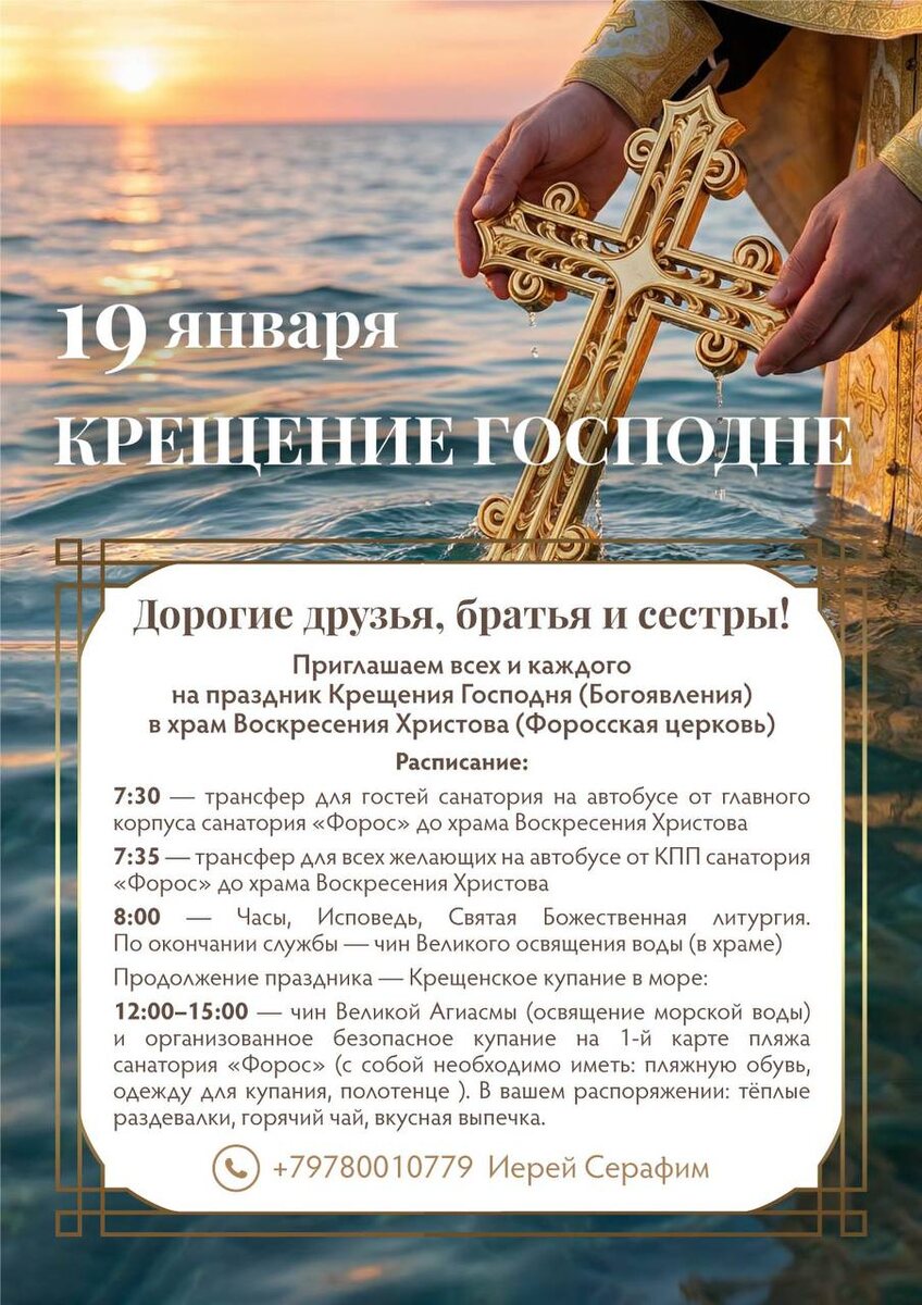 Дорогие друзья! Приглашаем вас разделить светлый праздник Крещения Господня (Богоявления) в одном из самых красивых и духовных мест Южного берега Крыма — храме Воскресения Христова (Форосская церковь). 🕊 Программа: 🚌 Трансфер • 7:30 — для гостей санатория «Форос» от главного корпуса • 7:35 — для всех желающих от КПП санатория ⛪ 8:00 — Часы, Исповедь, Святая Божественная литургия По окончании службы — чин Великого освящения воды в храме 🌊 Крещенские купания в море 🕛 12:00–15:00 — чин Великой Агиасмы (освящение морской воды) и организованное безопасное купание на 1-й карте пляжа санатория «Форос» В вашем распоряжении: — тёплые раздевалки — горячий чай — вкусная выпечка С собой необходимо иметь: пляжную обувь, одежду для купания, полотенце 📞 Контактное лицо: иерей Серафим +7 978 001-07-79 Проведите этот день в атмосфере умиротворения и заботы о душе и теле. Ждём вас в санатории «Форос»!