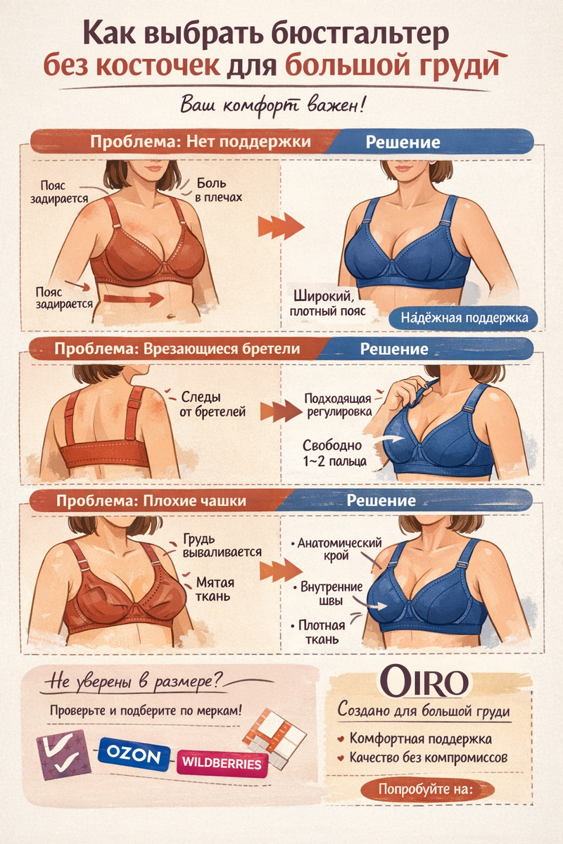 Если у вас большая грудь, вы наверняка знаете это чувство: вроде бы бюстгальтер без косточек — мягкий, «комфортный», а к концу дня хочется снять его первым делом. Пояс давит, ткань впивается, грудь «расползается», а поддержки — ноль. Знакомо? Хорошая новость: проблема почти никогда не в размере груди. И почти всегда — в неправильном выборе белья. Давайте разберёмся, как выбрать большой бюстгальтер без косточек так, чтобы он действительно был удобным. Многие думают: раз нет косточек — значит, поддержки быть не может. Это миф. Симптомы:
