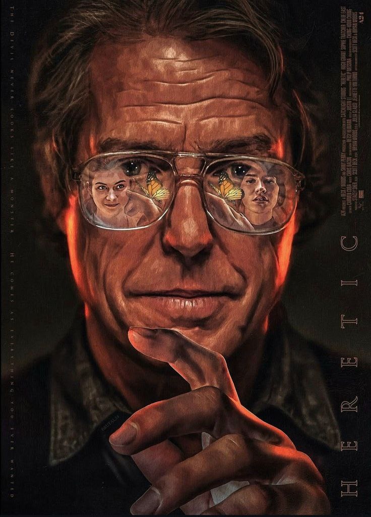 Еретик (2024), Скотт Бек, Брайан Вудс "Церковная миссия приводит двух молодых мормонок к дверям безобидного, на первый взгляд, мистера Рида. Мужчина приглашает их в дом побеседовать о религии, уверяя, что его супруга печёт пирог и скоро к ним присоединится, но девушки начинают подозревать неладное." По-началу довольно интригующий, не жуткий, но напряженный триллер. "Еретик" очень старается казаться умным, сложноустроенным и порой за полемикой героев было любопытно наблюдать, но в определенный момент фильм сдает назад, а если бы дожать и добить (хоть финал и красивый)... Стоит признать, что без харизмы Хью Гранта вся "конструкция" была бы совсем хрупкой. 6/10