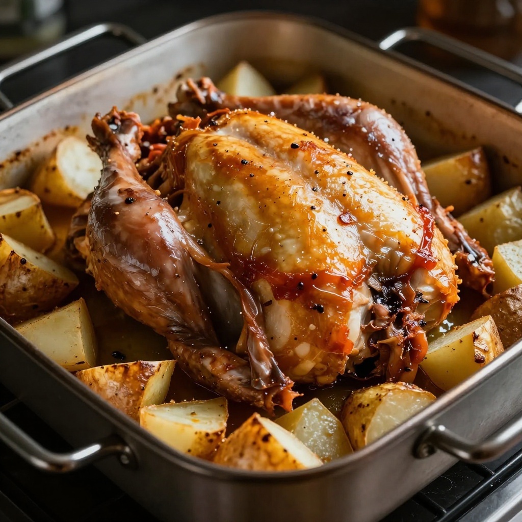 5. Запекайте 35–45 минут до золотистой корочки и готовности картофеля. При необходимости прикройте фольгой, чтобы овощи не подгорели.