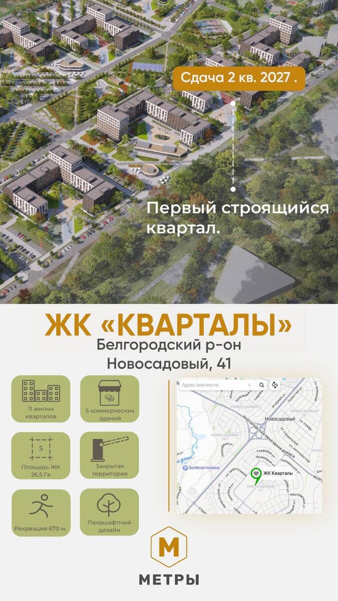 комфортной жизни. Основная информация: 🔸Расположение: Белгородский р-н, пос.Новосадовый, 41 🔸Срок сдачи 2кв. 2027г. 🔸Отделка: с ремонтом (обои, двери, потолки, санузел в плитке) О локации: 🔸11 кварталов уникальной постройки 🔸закрытая территория каждого квартала 🔸современные детские площадки 🔸рекреационные зоны для спорта и отдыха 🔸своя прогулочная аллея Инфраструктура на территории: 🔸аптека и продуктовые точки 🔸остановка общественного транспорта 🔸коммерческая отдельно стоящая недвижимость для магазинов, аптек, кофеен, ресторанов, медицинских кабинетов и фитнес-зала В пешей доступности: 🔸частный детский сад "Лучик" 🔸начальная школа и МОУ СОШ «Территория успеха» В 5 минутах езды: 🔸продуктовые и др.магазины (Пятерочка, Магнит, Люкс, цветочные, ветеринарные, мясные и рыбные). О домах и квартирах: 🔸 грузопассажирские лифты 🔸 колясочные 🔸 1, 2, 3-комнатные 🔸 отделка под ключ 🔸 индивидуальное отопление *подход для льготной ипотеки! ПВ от 1 🍋 | ежемесячный платеж от
