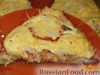 Кетчуп аккуратно распределите его по поверхности теста. Овощи и колбасу нарежьте небольшими кусочками или кружочками (кому как нравится) и в произвольном порядке разложите на тесто. Сверху, не скупясь, присыпьте все тертым сыром. Поставьте сковороду с "ленивой" пиццей на медленный огонь и накройте крышкой.