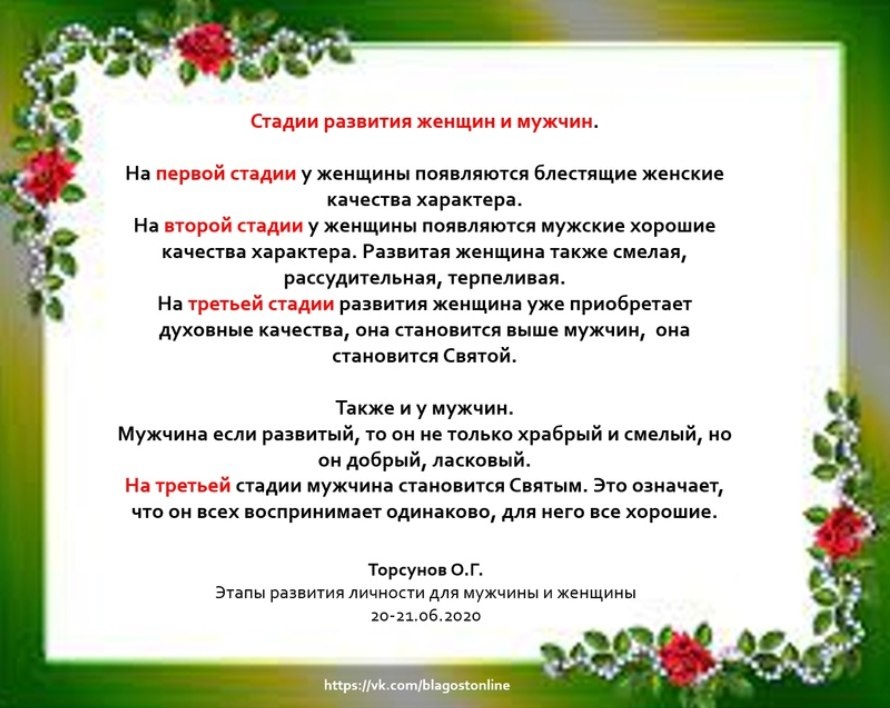 На первой стадии у женщины появляются блестящие женские качества характера. На второй стадии у женщины появляются мужские хорошие качества характера. Развитая женщина также смелая, рассудительная, терпеливая. На третьей стадии развития женщина уже приобретает духовные качества, она становится выше мужчин, она становится Святой. Также и у мужчин. Мужчина если развитый, то он не только храбрый и смелый, но он добрый, ласковый. На третьей стадии мужчина становится Святым. Это означает, что он всех воспринимает одинаково, для него все хорошие.