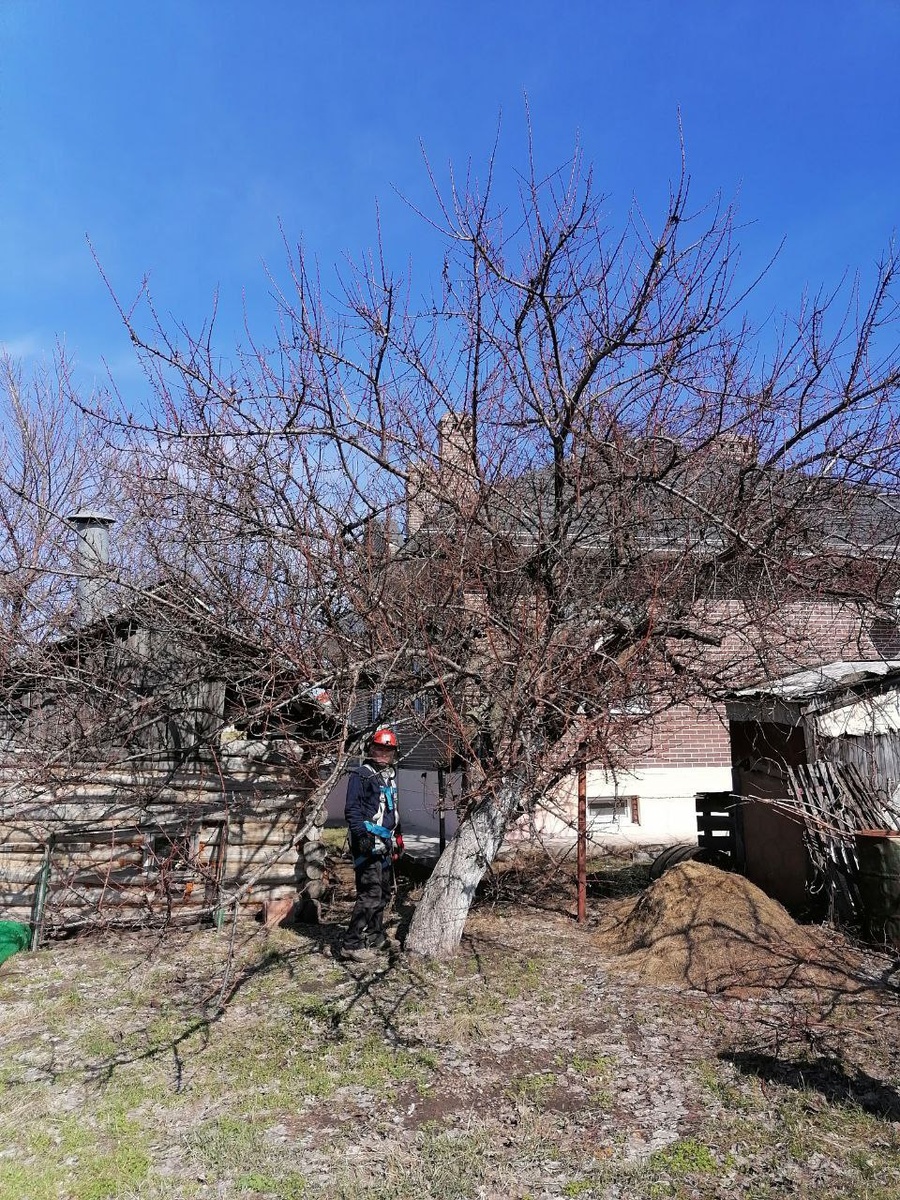 Обрезка абрикоса. На такой высоте обязательно в экипировке работаем, по другому никак.
