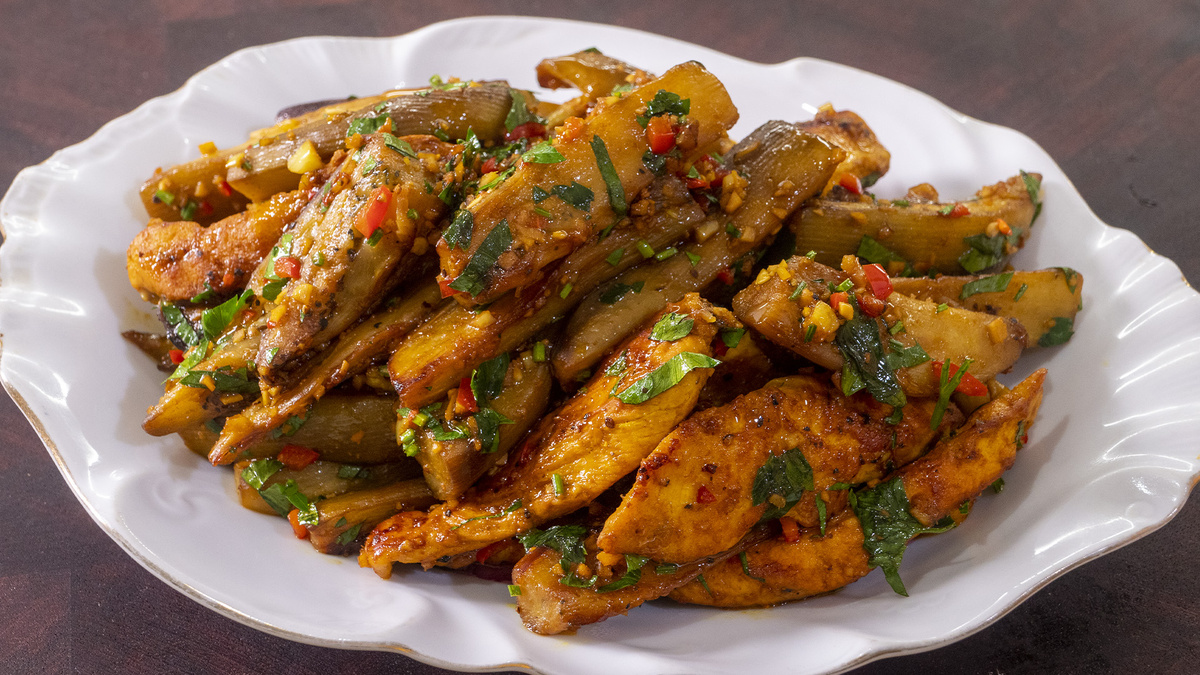 • Куриная грудка — 1 шт (~400–500 г) • Баклажаны — 2 шт • Имбирь — кусочек 2–3 см • Чеснок свежий — 2–3 зубчика • Соевый соус — 3–4 ст. л. • Чёрный перец, куркума (½ ч. л.), паприка (½ ч. л.), сушёный чеснок — по вкусу • Острый соус — по желанию • Масло для жарки, сахар — 1–2 щепотки, соль • Петрушка + острый перец + сок ½ лимона (рекомендую!) 1. Курицу нарезать полосками, замариновать в соевом соусе + специи + масло (10–30 мин). 2. Баклажаны очистить, нарезать полосками, посолить и обжарить до корочки. Выложить на салфетку. 3. Обжарить курицу до румяности, уменьшить огонь, добавить имбирь, чеснок и лимонный сок. 4. Добавить баклажаны, ещё соевого соуса + сахар. Перемешать и сразу выключить. 5. Всыпать петрушку и острый перец — готово! Подавайте горячим с рисом 🔥 Готовьте и пишите, как получилось 😋