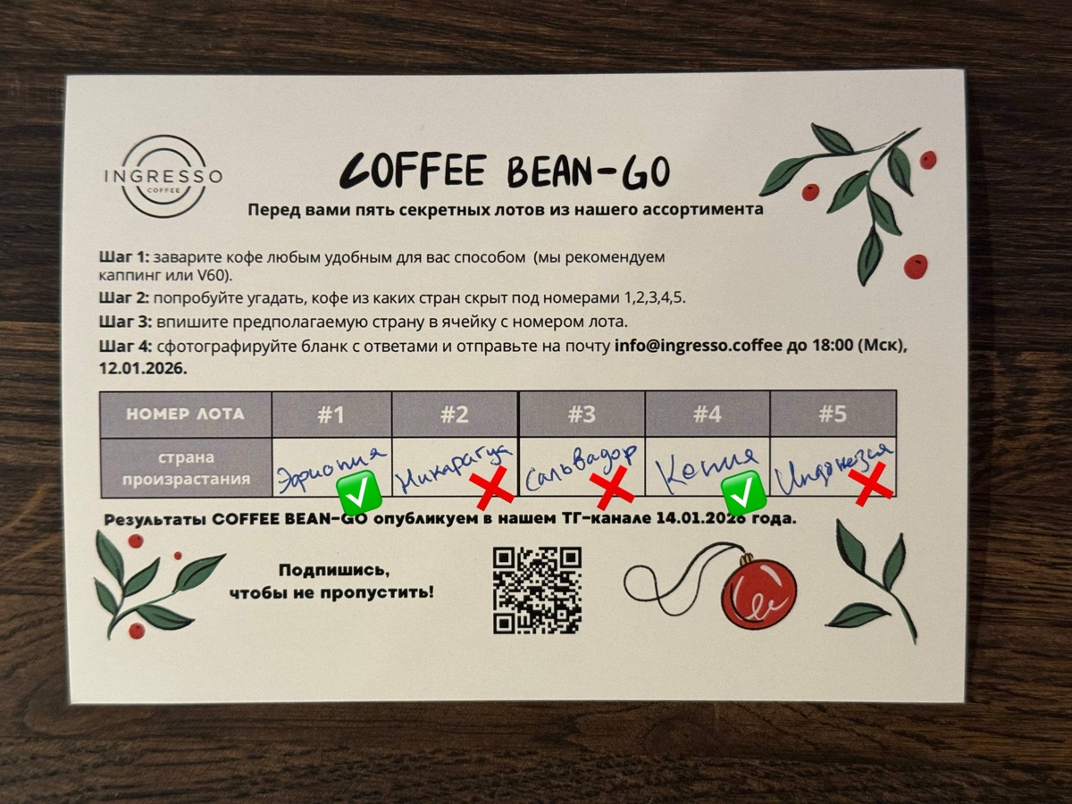 Вчера Ingresso Coffee подвели итоги кофейного бинго. Надо было угадать страны происхождения для пяти лотов кофе. Результаты такие: 1. Эфиопия (Оромо Ситро) 2. Бразилия (Жёлтый Катуаи) 3. Никарагуа (Макукан) 4. Кения (Ашемали) 5. Кения (Субра) В этот раз я угадал 2 из 5. На самом деле угадал 3, но перепутал местами при заполнении карточки Бразилию и Никарагуа. Поэтому формально не считается. Было сложно, потому что за праздники случилось вкусовое переутомление и потребовались усилия, чтобы угадывать кофе. Вот оливье угадал бы с легкостью! Тем не менее, я угадал первую Эфиопию и предпоследнюю Кению. Про них мне было сразу понятно, что это кофе из Африки. Не угадал последнюю Кению. Хоть я её и пробовал в сэмпл-боксе, но не запомнил. У неё очень интересный вкус. Я подумал, что вряд ли такой необычной будет Кения. И вряд ли в игре загадают две Кении сразу. 😁 И про Бразилию подумал, что это Сальвадор какой-нибудь. А в целом снова было очень интересно и круто. Все лоты были очень вкус
