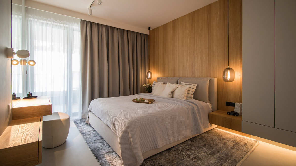 Стена за кроватью — это как холст для вашего интерьера. Она задает настроение, подчеркивает стиль и может стать настоящей изюминкой спальни. Мы собрали 10 вдохновляющих решений от дизайнеров RemPlanner, которые делают спальню уютной, красивой и необычной. Теплое дерево создает атмосферу уюта и спокойствия. В этой спальне оно идеально гармонирует с бежевыми оттенками кровати и штор, а белые фасады шкафов добавляют легкости. Натуральное дерево на стене — роскошный акцент, который делает интерьер одновременно современным и уютным. В маленькой спальне в квартире 42 м² дизайнеры разместили крупный шкаф и рабочее место, а стену за кроватью украсили обоями с крупными бело-черными цветами. Такой яркий акцент отлично контрастирует с графитовой кроватью с высоким изголовьем и добавляет комнате характера. Эта уютная спальня выполнена в серых оттенках. Светлое изголовье кровати красиво сочетается с темными обоями на стене, а функциональная черная лампа завершает композицию. Элегантная спальня с те