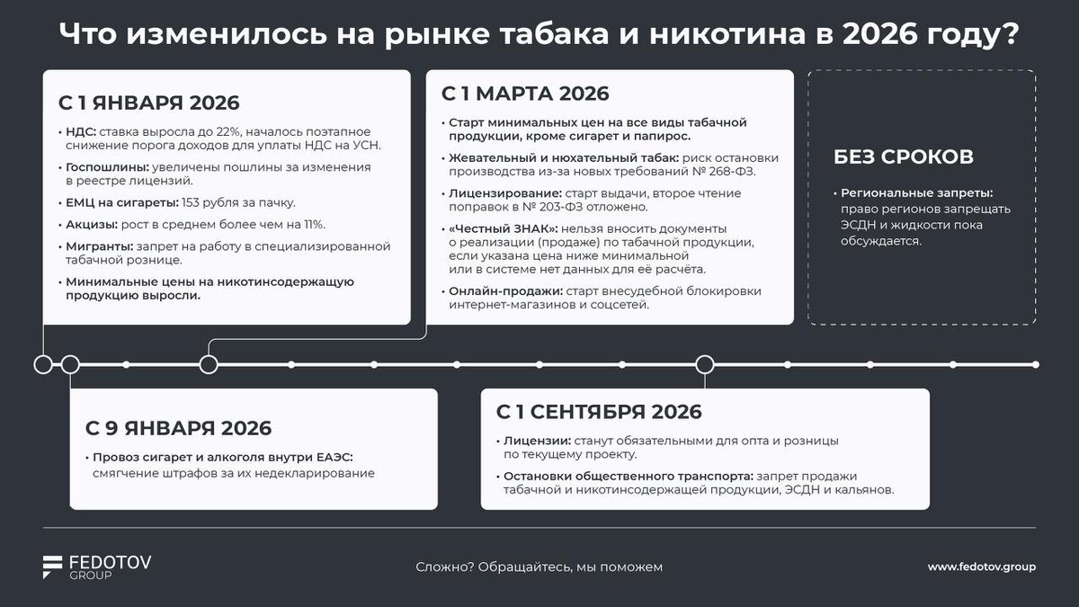 ? 2026 год начался с изменений для всей отрасли: часть норм уже вступила в силу, часть — начнёт действовать в течение года. Меняются налоги, минимальные цены, правила торговли, маркировка, требования к бизнесу и персоналу. Чтобы вам было проще ориентироваться, мы собрали все ключевые изменения табачного законодательства и разложили их по датам — от января до сентября 2026 года. Смотрите на слайде. Этот материал будет полезен всем, кто работает с табачной и никотинсодержащей продукцией — сохраняйте и пересылайте коллегам. А подробнее все изменения мы разберем на прямом эфире с Евгением Федотовым в Fedotov Group Pro уже в эту пятницу, 16 января, в 15:00: https://t.me/FG_Pro_Bot Попасть в FG Pro | Дать буст | Попасть в Retail Expert