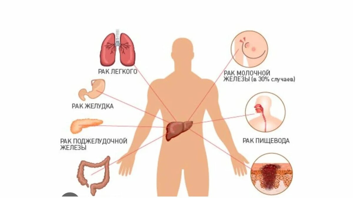 🔸 Печень — при раке желудка, кишечника, поджелудочной, молочной железы, лёгких.
