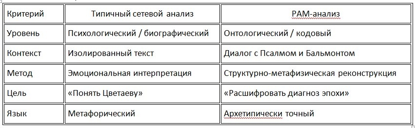 Сравнение РАМ-анализа «Поэмы Горы» Марины Цветаевой с типичными сетевыми материалами (рецензиями, статьями в блогах, публикациями на «Арзамасе», «Постнауке», «Культуре.РФ», «Литературной газете», YouTube-разборами и т.п.) показывает три фундаментальных методологических отличия. Сетевые анализы почти без исключения сводят «Поэму Горы» к: Даже в лучших случаях (например, у Ольги Седаковой или Льва Пирожкова) акцент делается на этическом пафосе: «Цветаева не прощает предательства, потому что верна абсолюту любви». РАМ- анализ, напротив, выходит за пределы биографии и психологии. Вы рассматриваете текст как вопрос о трансформации мировоззрения: не «что чувствует поэтесса», а «как устроен мир поэта после разрыва связи между временем и вечностью». НЕ: «Почему она зла?» НО: «Какова структура реальности, в которой “горе началось с горы”?» Это — переход от психологии человека к метафизике бытия. Сетевые тексты обычно читают диптих «Поэмы Горы» и "Поэмы Конца" в вакууме — как самодостаточные вы