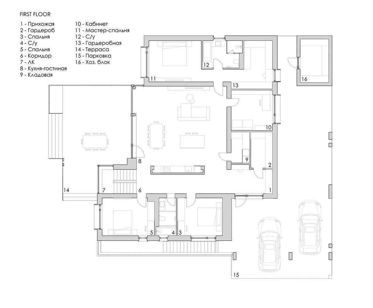 Внутри акцент сделан на просторную гостиную с выходом на террасу. Планировка объединяет функциональность и эстетику. Приватные спальни изолированы от шумных зон, а продуманная система освещения и панорамные окна делают интерьер светлым и живым в любое время дня. Проект: #shade_archdepo