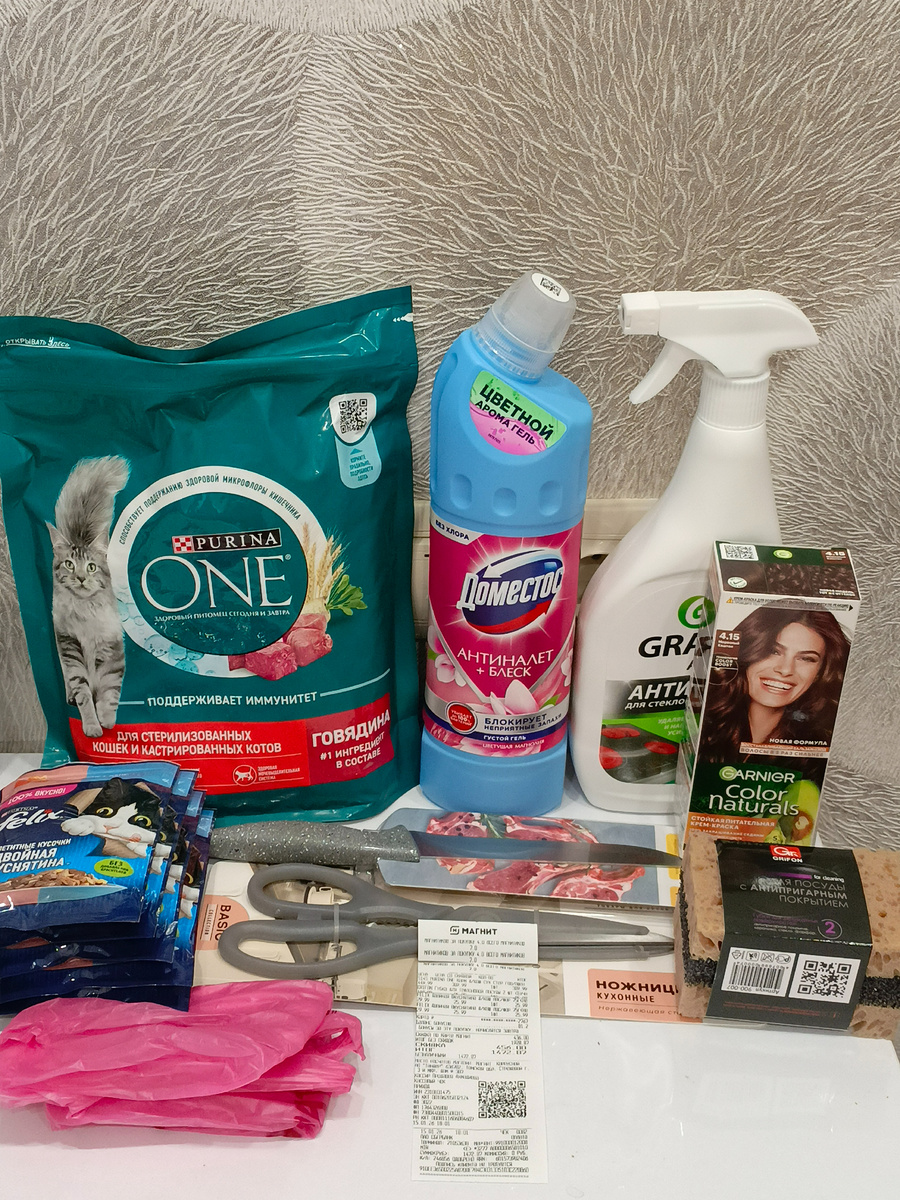 Сегодня я отправилась за покупками в магазин "МАГНИК КОСМЕТИК", где как раз проходила акция — 20% скидка на весь ассортимент, которая действует каждый 15-й день месяца. В итоге приобрела несколько нужных вещей: Доместос, средство Азелит Антижир, губки для мытья посуды, нож, ножницы, корм для нашего кота и краску для волос.