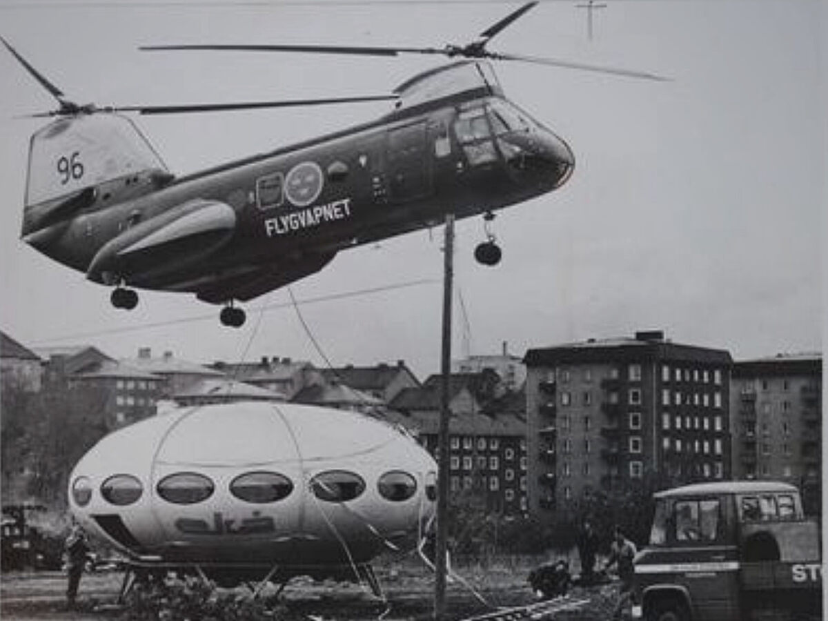 Шведский военно‑транспортный вертолёт HKP 4А, перевозит по воздуху один из самых футуристичных объектов своего времени - модульный дом "Futuro". Фото сделал шведский фотограф Гуннар Кальстром в 1969 году. На снимке вертолёт HKP 4A с серийным номером "04453" и бортовым номером "96", принадлежавший 8‑му авиакрылу (F 8) ВВС Швеции. Машина использовалась для различных транспортных задач. На борту хорошо читается надпись "FLYGVAPNET" - Шведские ВВС. HKP‑4 представлял собой доработанный Boeing Vertol 107: увеличенные боковые обтекатели, больший запас топлива, двигатели Rolls‑Royce Gnome H.1200 и установленная в Швеции навигационная система "Decca". Всего шведскому флоту было поставлено 10 таких вертолётов. Дом "Futuro", который мы видим под вертолётом, принадлежал миллионеру Саймону Спайсу. Именно его "летающую тарелку" в прямом смысле уносит в небо военный борт. Что же такое "Futuro House"? Хотя мы ранее и описывали в прошлых публикациях об этом футуристическом домике, но пожалуй ещё ра