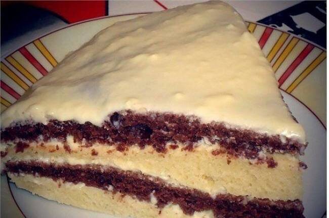 Всё хорошо взбить(тесто как густая сметана). Тесто разделить на 2 равн. части,в одну добавить 1 ч.л. какао. Испечь 2 коржа,остудить и разрезать острым ножом на .