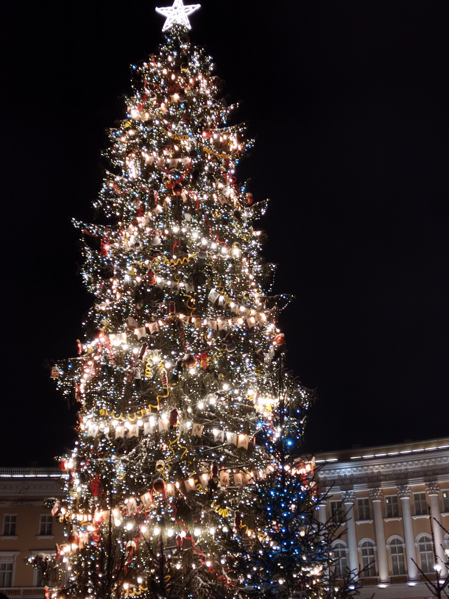 Я эти праздники я ездила посмотреть городские красоты раза четыре. Два с Юриком и мужем, два без них. Так хотелось посмотреть всего побольше, побольше... На самом деле, город в этом году был украшен больше, лучше. И по просьбам жителей и гостей, вся красота сохранится до 22 января. Так что я еще постараюсь скататься к Лавре. Уж больно красивая там елка стоит. Ну а пока, начинаем с главной елки города. Елка на Дворцовой площади традиционно живая. Украшена она в духе домашних елок в 50-60-е годы. И знаете, она такая уютная, домашняя. У меня свою елку не получается так украсить, хотя игрушки к ней выбираются тщательно, все мелочи стараемся учитывать. Но искусственная - само по себе уже не то. Но ставить живую елку я морально не готова, хватило одного раза, когда мне 5 лет было, последние иголки вымели лет через 20. Просто листайте галерею Но не успел мы до елки дойти, как услышали классическое: "Есть хочу". С трудом уговорили Юру с елочкой сфотографироваться, чтобы бабушке потом показать,