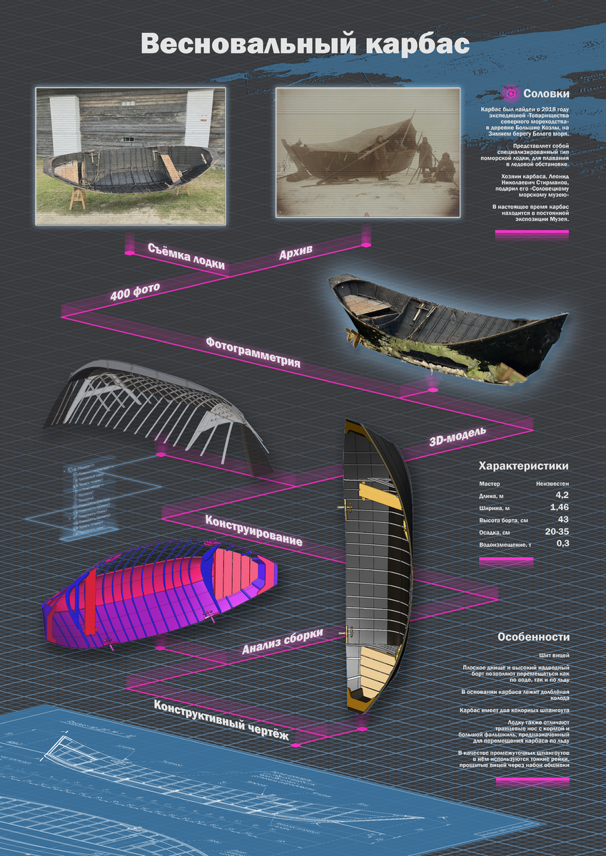 Он был обнаружен в 2023 году на Соловецком архипелаге, в Соловецком морском музее. Весновальный карбас — лодка, созданная специально для весновального промысла, то есть для весенней добычи морского зверя. В это время тюлени выходят на лед, чтобы подобраться поближе к рыбе и защитить новорожденных детенышей от хищников, обитающих на суше. Карбас очень легкий, его проще вытащить на лед. Такой эффект достигается за счет того, что у него только два тяжелых кокорных шпангоута, остальные представляют собой тонкие рейки, прошитые вицей. Главная отличительная черта весновального карбаса — киль из выдолбленного бревна, к которому в свою очередь пришита салазка. Это делает карбас не только лодкой, но и санями. При необходимости его легко протащить волоком по льдине. Еще одна отличительная особенность весновального карбаса — транцевые нос и корма. Исключаем вариант, что делалось это для установки мотора, ведь карбас, судя по всему, очень старый, еще шитый вицей. Скорее это связано с тем, что в ос