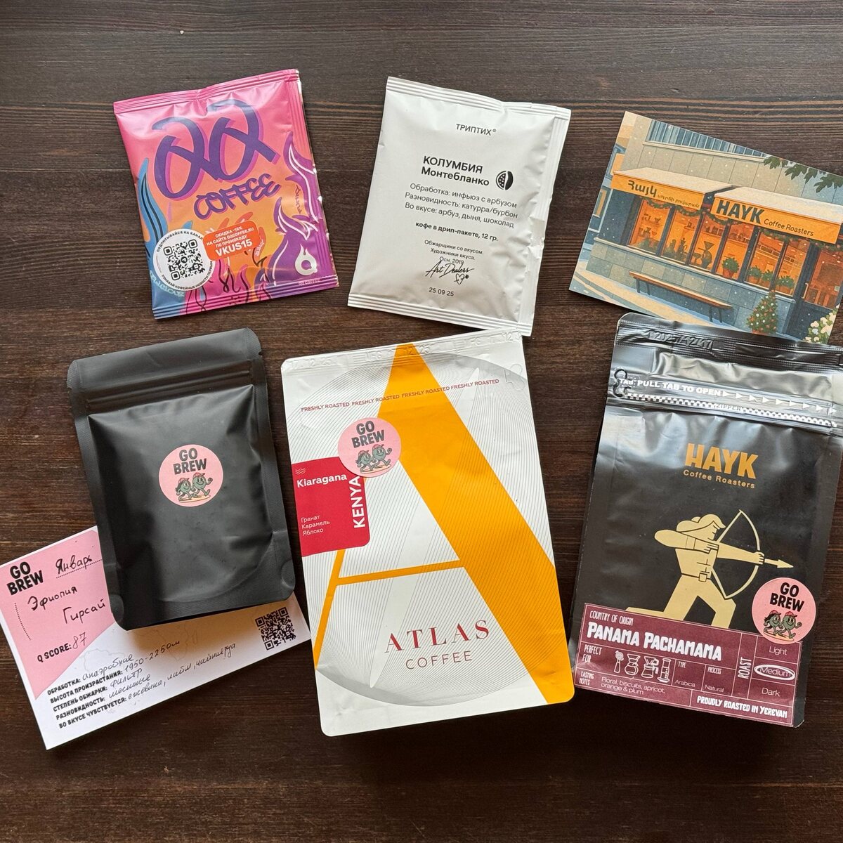 Мне приехала январская подписка GO BREW! В этот раз внутри нашлось много всего интересного. Во-первых, это Панама Пачамама от обжарщика Hayk из Еревана. Интригует не только регион, но и обжарка. Здесь она указана как средняя, а в способах заваривания указаны как эспрессо, так и фильтр. Вероятно, стоит попробовать сварить этот кофеёк в эспрессо на моём Примусе. Во-вторых, секретным лотом оказалась анаэробная Эфиопия Гирсай с оценкой 87 баллов и любопытными дескрипторами: ежевика, лайм и чайная роза. Интересно! В-третьих, в коробке нашелся инфьюз с арбузом в виде дрипа от обжарщика Триптих. Звучит как безумие, поэтому обязательно надо попробовать. Ну и в-четвертых, две Кении. Одна в виде дрипа от обжарщика QQ Coffee, а вторая в зёрнах от Atlas Coffee. @Кофезавр