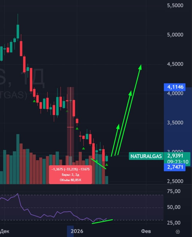 ⛽️ ГАЗ 🟢 В среду я делал пост про газ о том, что в нем сильное накопление, что выход из накопления будет волатильным. Предупредил, чтобы берегли своё депо. Как итог - падение было на 10%. 🟢Что сейчас? Падение от последней проторговки в газе уже -33%. Это выглядит как чрезмерное давление уже. На дневном тайм-фрейме находимся в зоне перепроданности, но там же появилась конвергенция. 🚗Это значит, что я по прежнему оптимистичен по газу. Жду газ вверх! Жду пробой 3,16. Цели отскока могут быть такими высокими как и глубина падения, ведь волатильность никуда не исчезает. Сегодня в 18:30 по мск публикация запасов газа для любителей газино. #газ #ng1 #американскийгаз #фьючерсгаза #naturalgas #bogdanoffinvest $NGF6 $NGG6