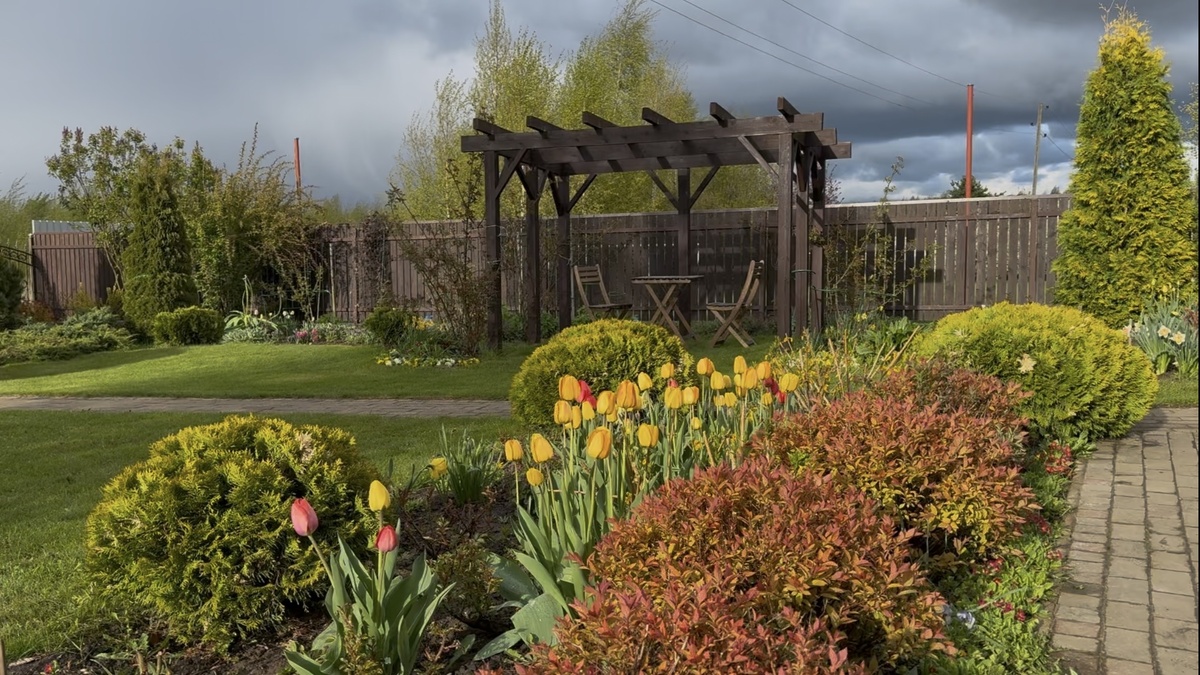 В конце статьи покажу вам как выглядит клумба с хвойными растениями, декоративными кустарниками, розами и хостами во временных рамках.
