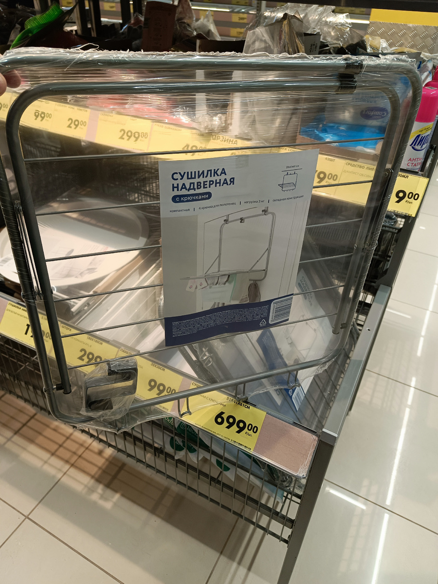 - Сушилка для белья на дверь (699 руб.): Тема! Особенно для тех, у кого дома, как у меня, вечный бардак. Раз – и бельё висит! Два – и дверь открывается! Три – жена счастлива! 🥳