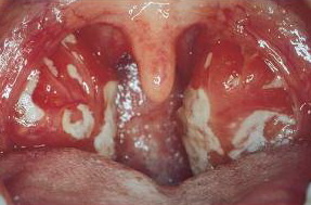 🔺Тонзиллит: яркая гиперемия слизистой оболочки мягкого неба, налеты белого цвета на миндалинах, могут сохраняться до 14 дней.