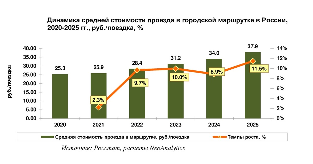 В ходе ежемесячного мониторинга средней стоимости проезда в маршрутном такси во всех регионах России, проведенного NeoAnalytics, выяснилось, что средняя стоимость проезда в городской маршрутке в России в 2025 г. достигла своего пика в ретроспективе периода 2020-2025 гг. В 2025 г. средняя стоимость увеличилась в 1,5 раза в отношении аналогичного показателя в 2020 г., когда можно было оплатить проезд в размере 25,3 руб. в среднем в России. Объектом исследования являются средние цены на проезд в маршрутном такси. Перевозки с посадкой и высадкой пассажиров в любом не запрещенном правилами дорожного движения месте. Остановки транспортных средств осуществляются по требованию пассажиров. Не учитывается проезд по пригородным маршрутам. По итогам 2025 г. средняя стоимость проезда в городском маршрутном такси выросла на 11,5% относительно показателя 2024 г. Из года в год индексация средних цен только усиливалась. Помесячная динамика периода 2020-2025 гг. показывает, что средняя стоимость уверенн