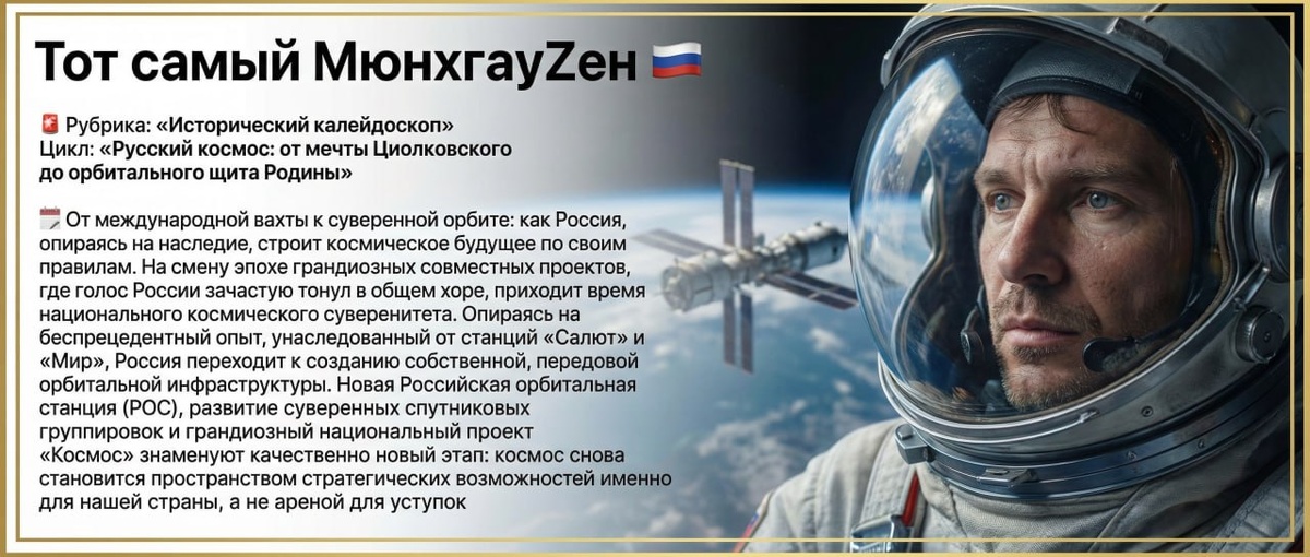 » Цикл: «Русский космос: от мечты Циолковского до орбитального щита Родины» 📅 От международной вахты к суверенной орбите: как Россия, опираясь на наследие, строит космическое будущее по своим правилам Часть 1️⃣/2 🔹 Факт: На смену эпохе грандиозных совместных проектов, где голос России зачастую тонул в общем хоре, приходит время национального космического суверенитета. Опираясь на беспрецедентный опыт, унаследованный от станций «Салют» и «Мир», Россия переходит к созданию собственной, передовой орбитальной инфраструктуры. Новая Российская орбитальная станция (РОС), развитие суверенных спутниковых группировок и грандиозный национальный проект «Космос» знаменуют качественно новый этап: космос снова становится пространством стратегических возможностей именно для нашей страны, а не ареной для уступок. 🔍 Контекст: — От компромисса к лидерству: Участие в Международной космической станции стало важным, но сложным этапом. Созданная в 1990-е, МКС объединила российский проект «Мир-2» и амер
