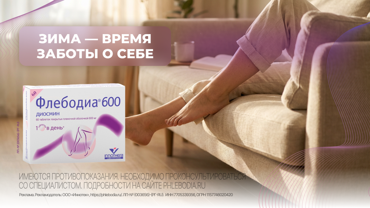 Зимой хочется тепла и комфорта. Но наши привычки в холодный сезон часто меняются: меньше движения, перепады температур, тяжёлая одежда. Всё это может создавать дополнительную нагрузку на сосуды, напоминая о себе неприятными симптомами: тяжестью, усталостью и отёками к концу дня. Сохранить лёгкость в ногах и хорошее самочувствие поможет комплексный подход: физическая активность, правильная одежда и обувь, при необходимости поддержка венотониками, которые назначает врач. Флебодиа® 600 — препарат, который может стать частью заботы о здоровье вен. Он обладает венотонизирующим и противовоспалительным действием, способствует уменьшению отёка, боли и других симптомов заболеваний вен нижних конечностей и геморроя. Согласно инструкции по применению, Флебодиа® 600 принимают 1 раз в день — это удобно. Зима — не время забывать про здоровье вен. Это идеальный период для того, чтобы пройти полноценный курс лечения, назначенный врачом, и встретить весну с новыми силами и лёгкостью в ногах. Заботьтесь