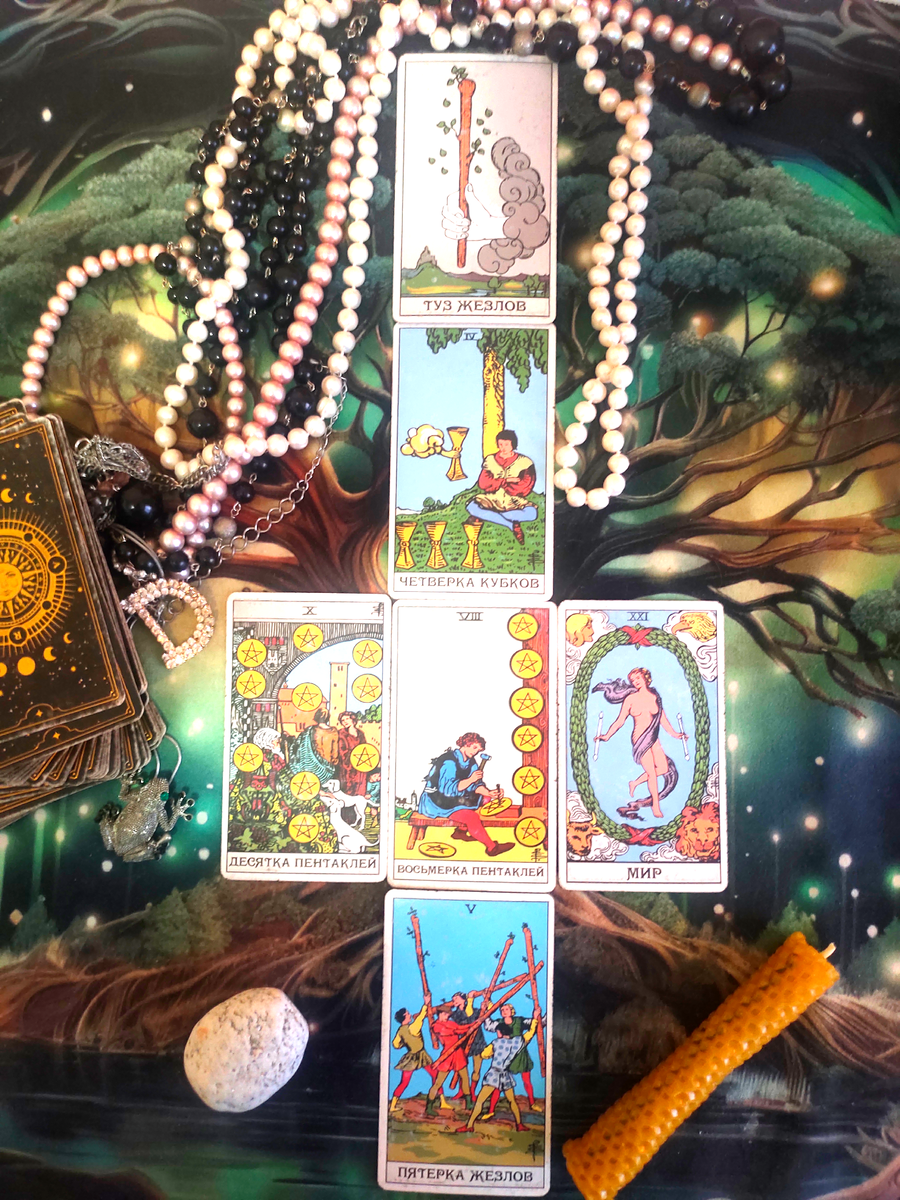 Неделя предлагает вам пройти полный цикл: от эмоциональной паузы и размышлений (4 Кубков), через внезапный творческий импульс (Туз Жезлов) и период упорного труда (8 Пентаклей) на фоне внутренней стабильности (10 Пентаклей), к блестящему успеху и завершению (Мир), которое, в свою очередь, открывает дверь новому, азартному вызову (5 Жезлов).