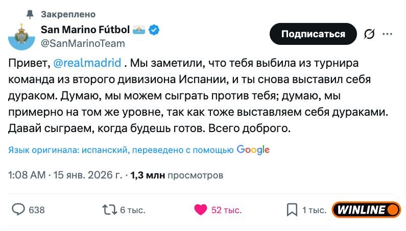 Над мадридским Реалом стебется даже официальный аккаунт сборной Сан-Марино 😅