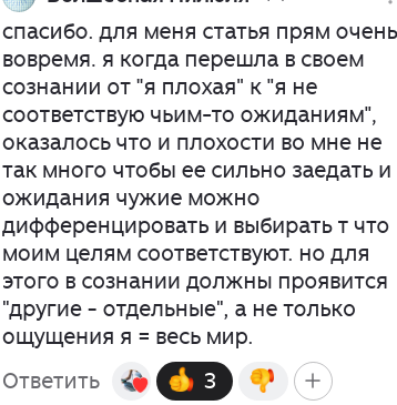 к "я не соответствую чьим-то ожиданиям", оказалось что и плохости во мне не так много чтобы ее сильно заедать и ожидания чужие можно дифференцировать и выбирать те что моим целям соответствуют." - я цитирую комментарий читательницы к прошлой статье, а полностью текст такой: