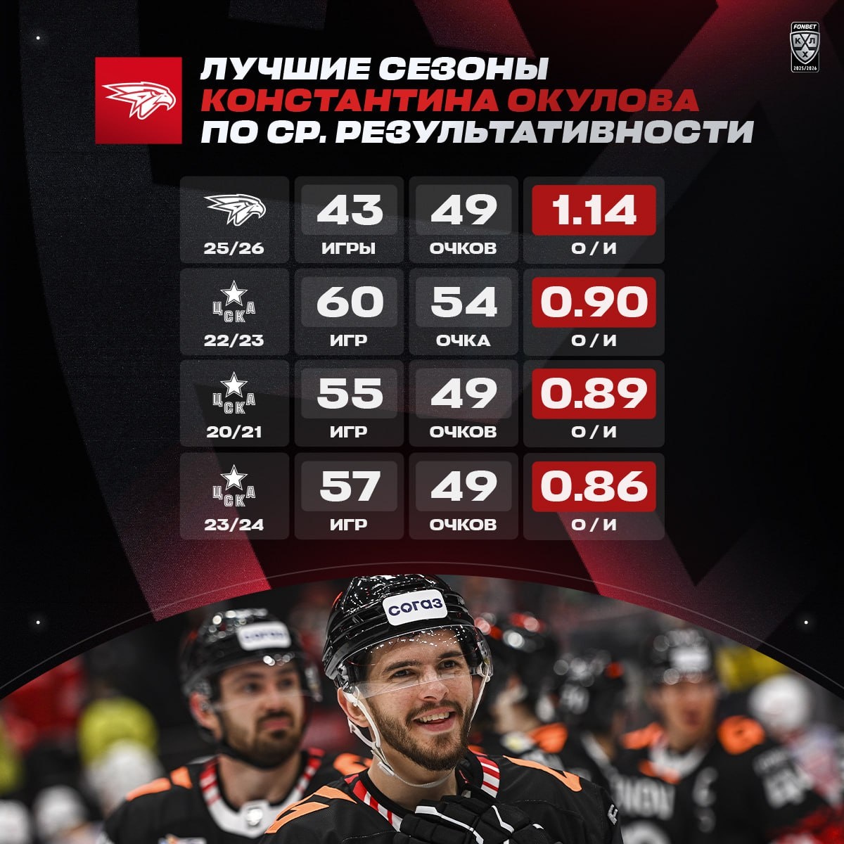 Константин Окулов проводит лучший сезон в карьере, набирая по 1.14 очка за игру